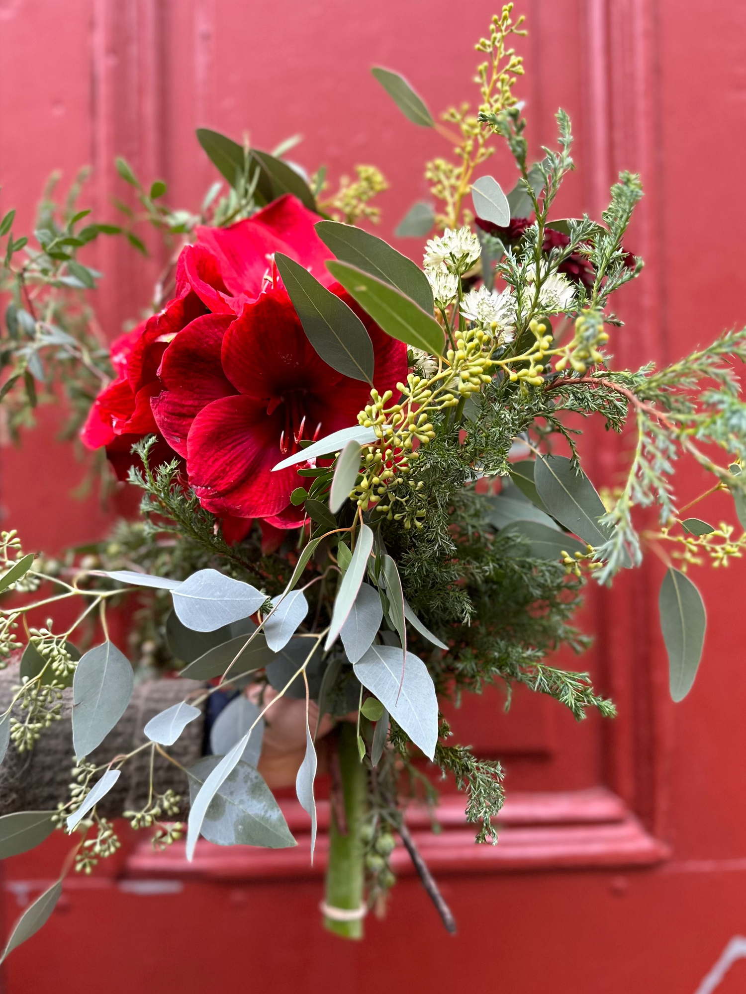 En fin bunden liten bukett, med en bas av olika gröna sorter, tillsammans med ditt val av färg på amaryllis.