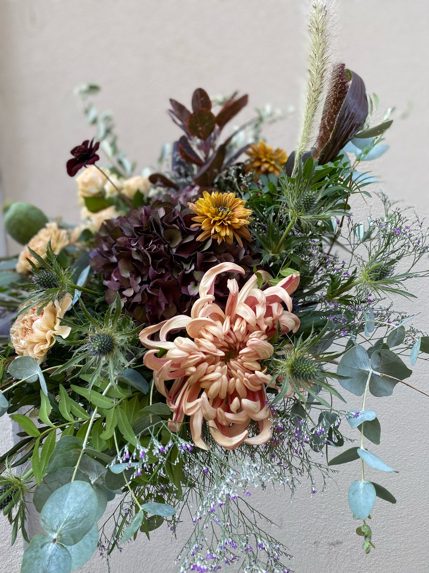 Härlig bukett i Nude/Aprikos med Blågrå inslag tillsammans med grönt. Sorter vi kan använda är krysantemum, limonium, nejlika. Går att beställa i 3 olika storlekar.