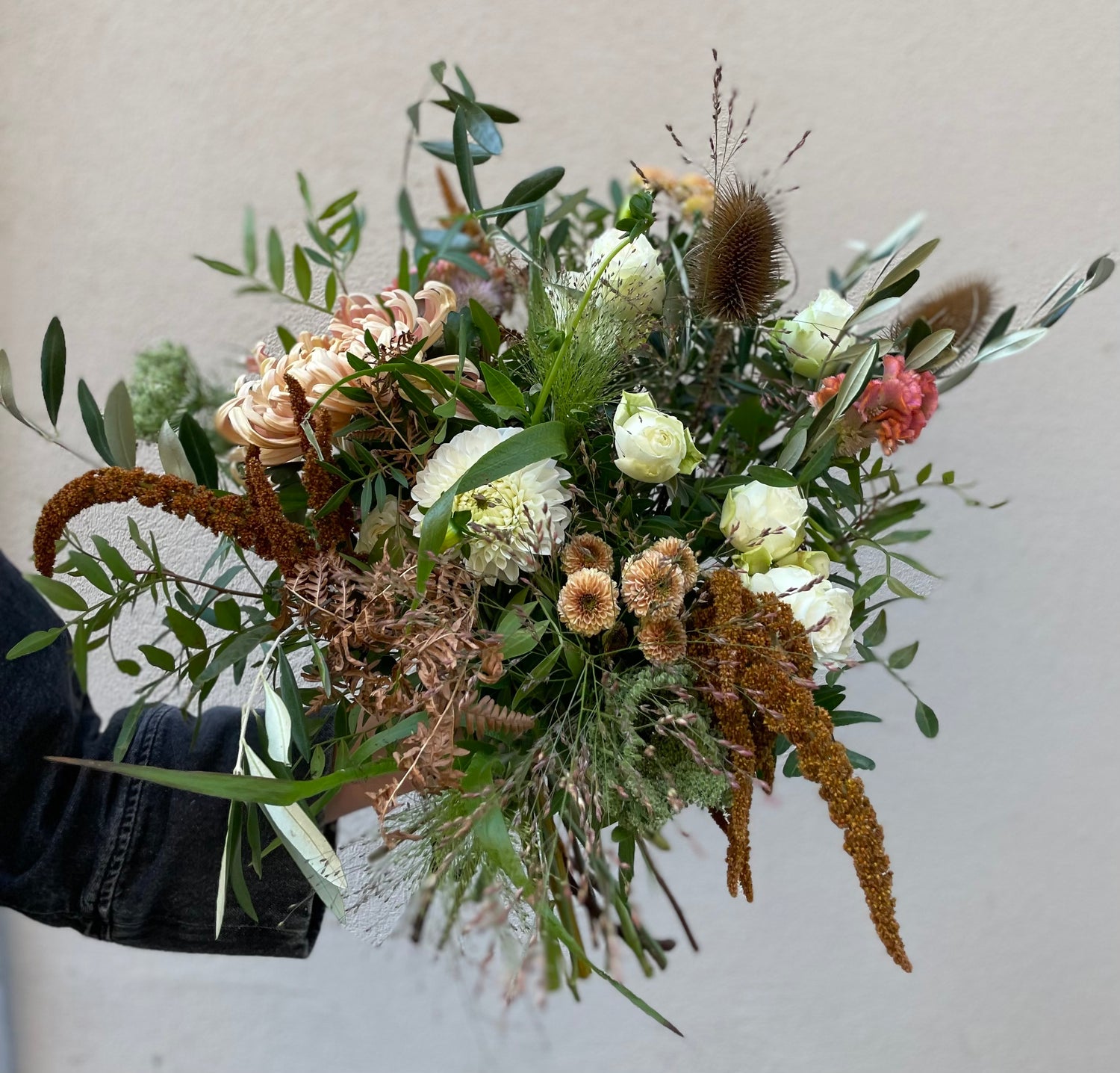 Bukett i vita, rostiga och gröna toner