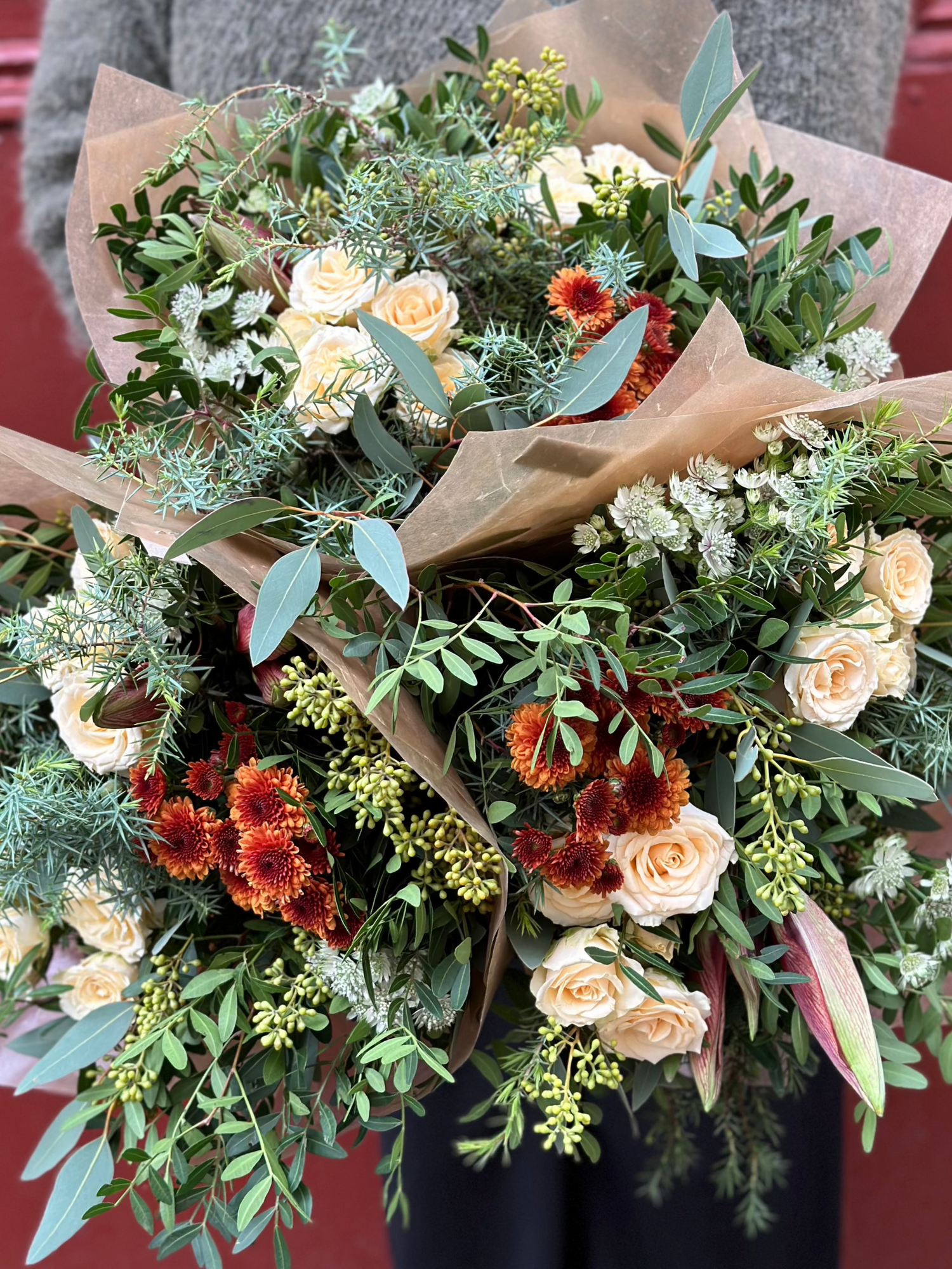 En bukett med dagens bästa blomster i härlig mix i grönt, rost och creme.